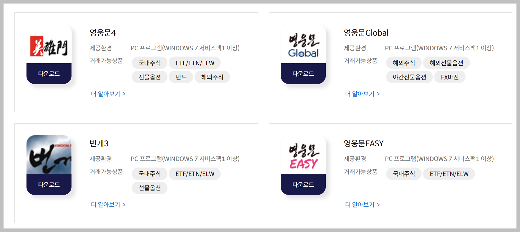 해당 페이지로 들어가면 위에 4개의 소프트웨어가 있습니다. 조금씩 용도가 다릅니다. 어떤것을 사용을 해야할지 모른다면 영웅문4를 이용하시면 됩니다. 해외선물옵션을 사용하지 않는다면 이것으로 대부분의 것들을 할 수 있습니다. 영웅문4는 초보 투자자에서 전문투자자 등 모든 사람에게 최적의 매매환경을 제공하고 있습니다.