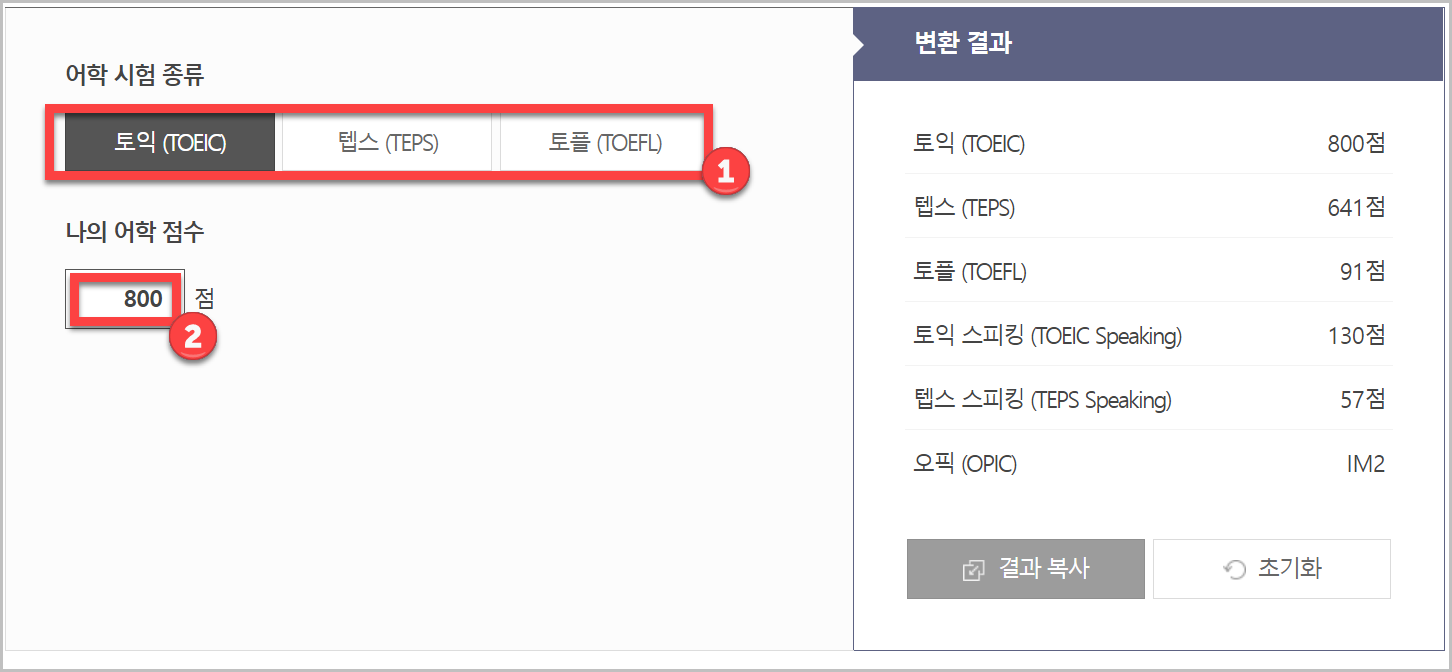위와 같은 화면에서 어학시험을 처음 선택하고, 점수를 입력을 하면 자동으로 환산이 되는 것입니다. 이러한 환산표는 완전하게 공인된 것은 아닌것으로 알고 있습니다.