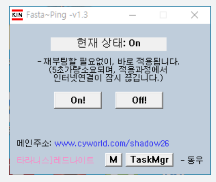 실행을 하면 위와 같은 화면이 나옵니다. 초기상태는 Off 로 되어 있는데 이를 On 으로 바꾸어 주면 됩니다. 설명에도 나아 왔지만 재부팅 할 필요 없이 바로 적용이 됩니다. 인터넷은 잠시 끊길 수 있습니다.