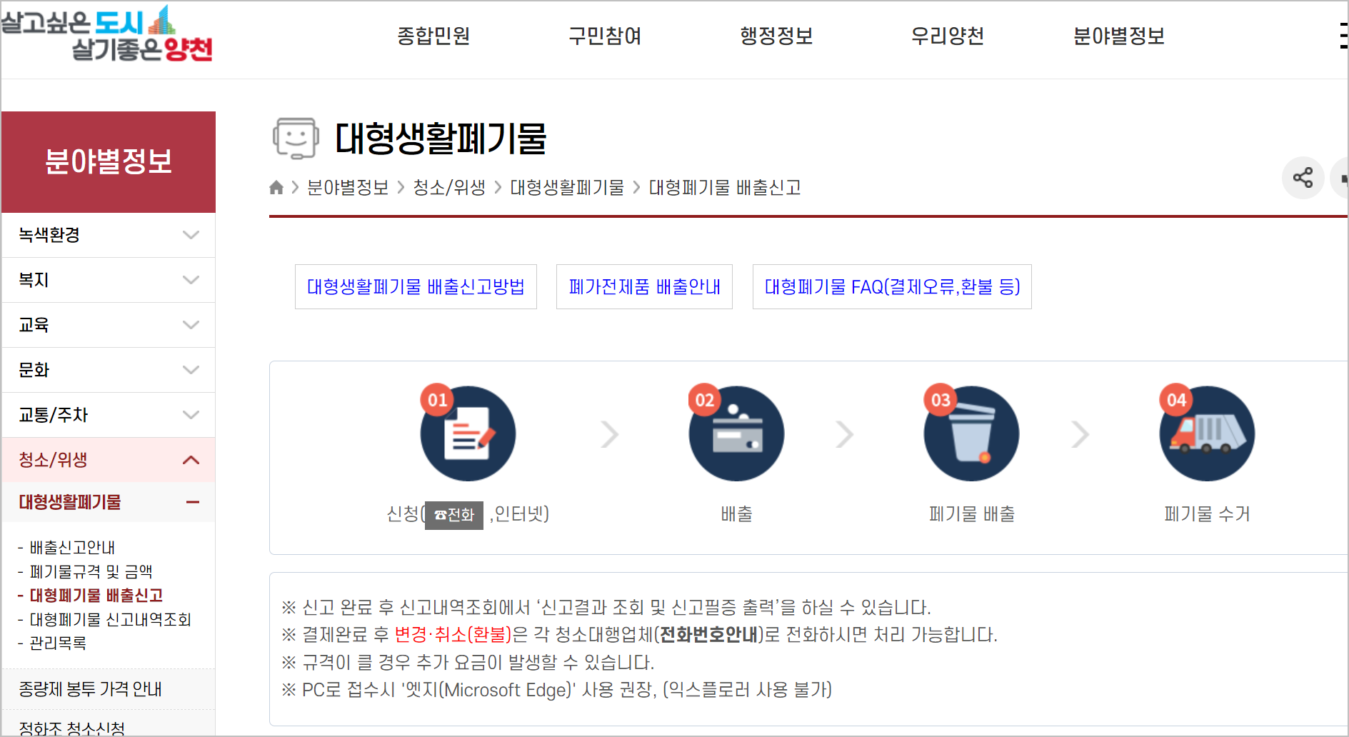 해당 홈페이지에 들어가면 위와 같은 화면이 나옵니다. 배출 일시와 장소 같은것들을 적어서 내면 신고필증을 출력할수 있씁니다. 그것을 붙이면 되는것이지요. A4로 출력해서 붙이면 되었습니다.