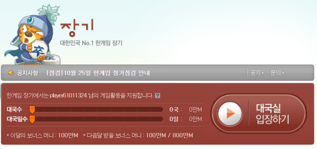정상적으로 로그인하였으면 위와 같이 홈페이지의 메인페이지로 이동하게 됩니다. 화면 중앙의 "대국실입장하기" 버튼을 클릭하면 대국실에 입장하여 게임을 플레이할 수 있습니다. (한게임장기가 처음인 경우에는 일회성으로 게임 설치절차가 진행됩니다. 설치절차는 매우 간단하며 안내에 따라 진행하면 어렵지 않게 설치를 마칠 수 있습니다. 게임설치가 잘 안되거나 어려움이 있는 경우는 링크를 참조하면 도움이 될 수 있습니다)
