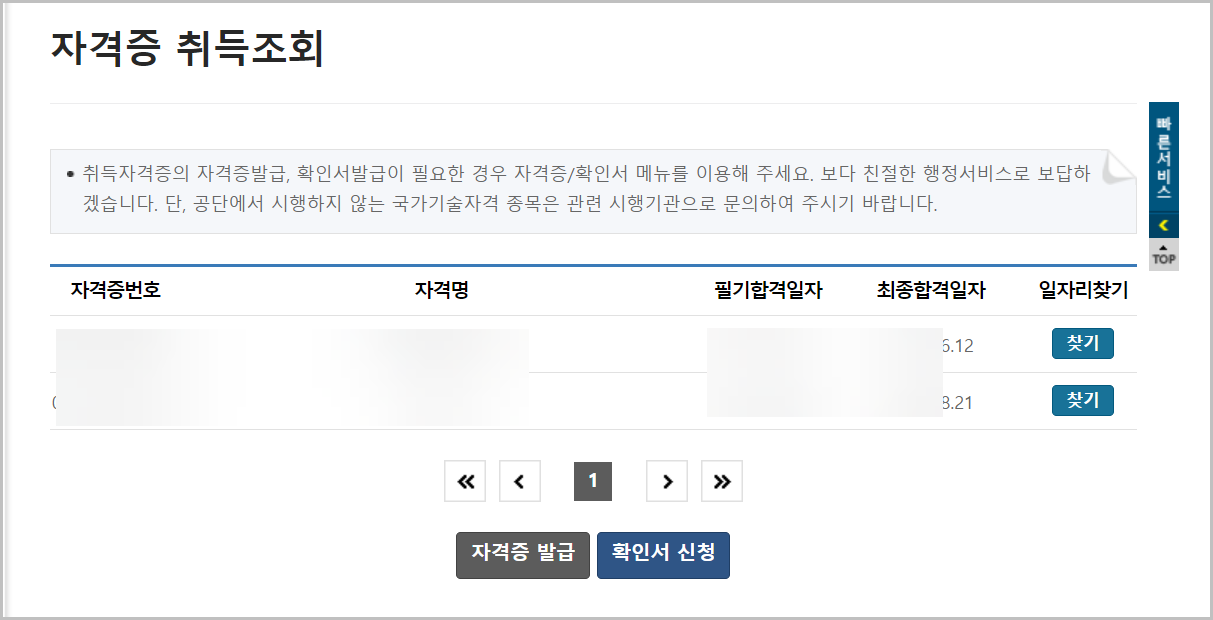 결과는 위와 같이 나오게 됩니다. 하단의 메뉴를 보면 확인서 신청과 발급 메뉴가 있습니다. 이를 통해서 추가적인 업무를 할 수 있습니다.