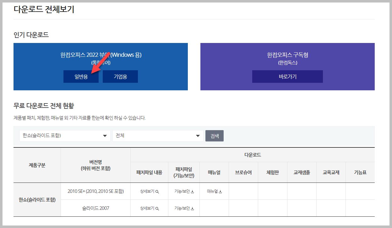 위 화면을 보면 뷰어를 다운로드 할수 있는 버튼이 있습니다. 일반용과 기업용으로 나뉘어져 있는데 적절히 구분해서 다운로드를 하시면 됩니다. 한쇼 뷰어만 별도로 설치하는 방법은 없고 한컴에서 만든 전체 프로그램의 뷰어를 설치하게 됩니다.