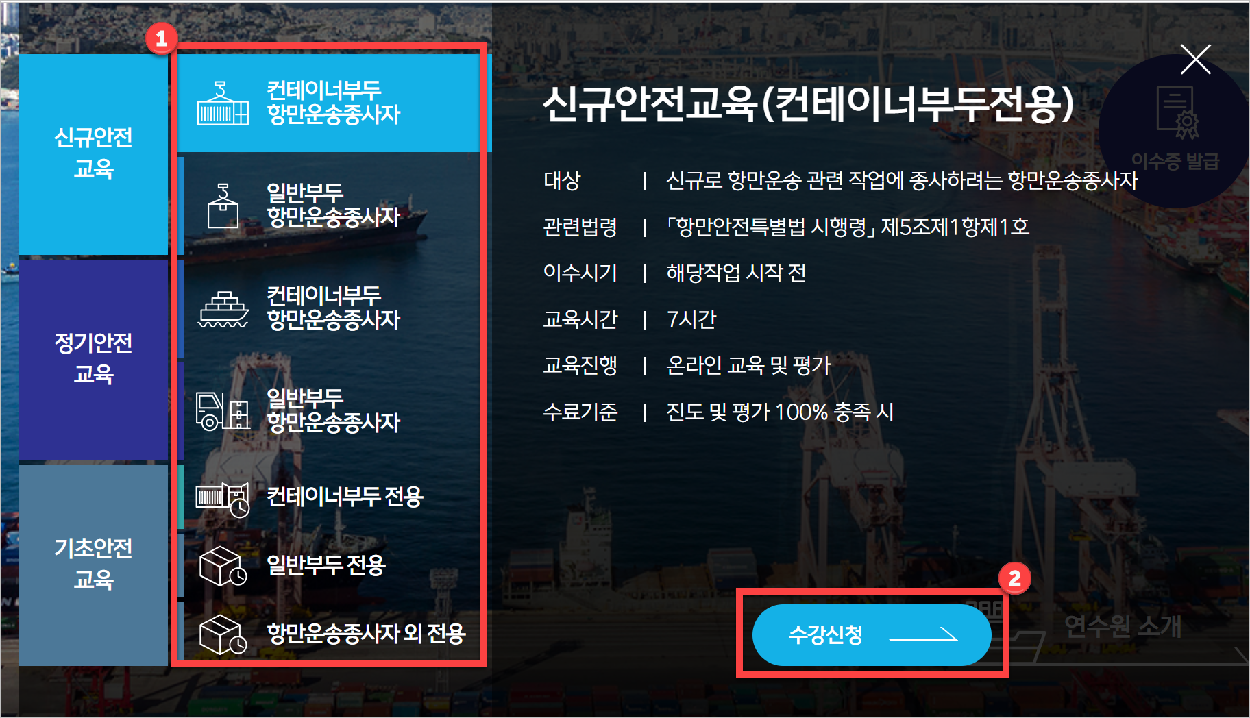 2022년 8월부터 시행된 '항만안전특별법'에 따라 항만 근로자와 항만을 출입하는 모든 관계자는 필수적으로 안전교육을 이수해야 합니다. 해양수산부는 편리하게 받을 수 있도록 '항만안전교육포털'(www.kptiedu.kr)을 개장하여, 누구나 집이나 사무실에서 인터넷을 통해 진행 할수 있도록 했습니다. 이 글에서는 이 서비스를 통해 과정을 신청하는 방법을 소개하겠습니다.