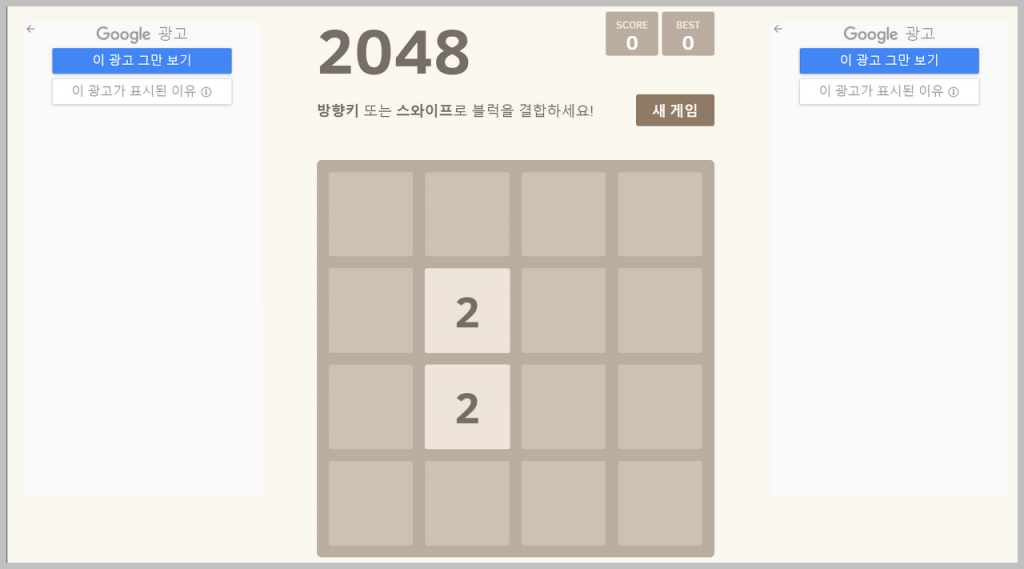 2048 을 플레이하려면 위의 링크를 클릭하여 접속할 수 있습니다. 한글로 잘 번역되어 있어서 언어의 장벽 없이 즐길 수 있습니다. 처음 도전할 때는 생각보다 어렵지만 적응하면 쉬워지는 편 입니다. 저도 굉장히 많이 플레이 했던 기억이 있습니다.