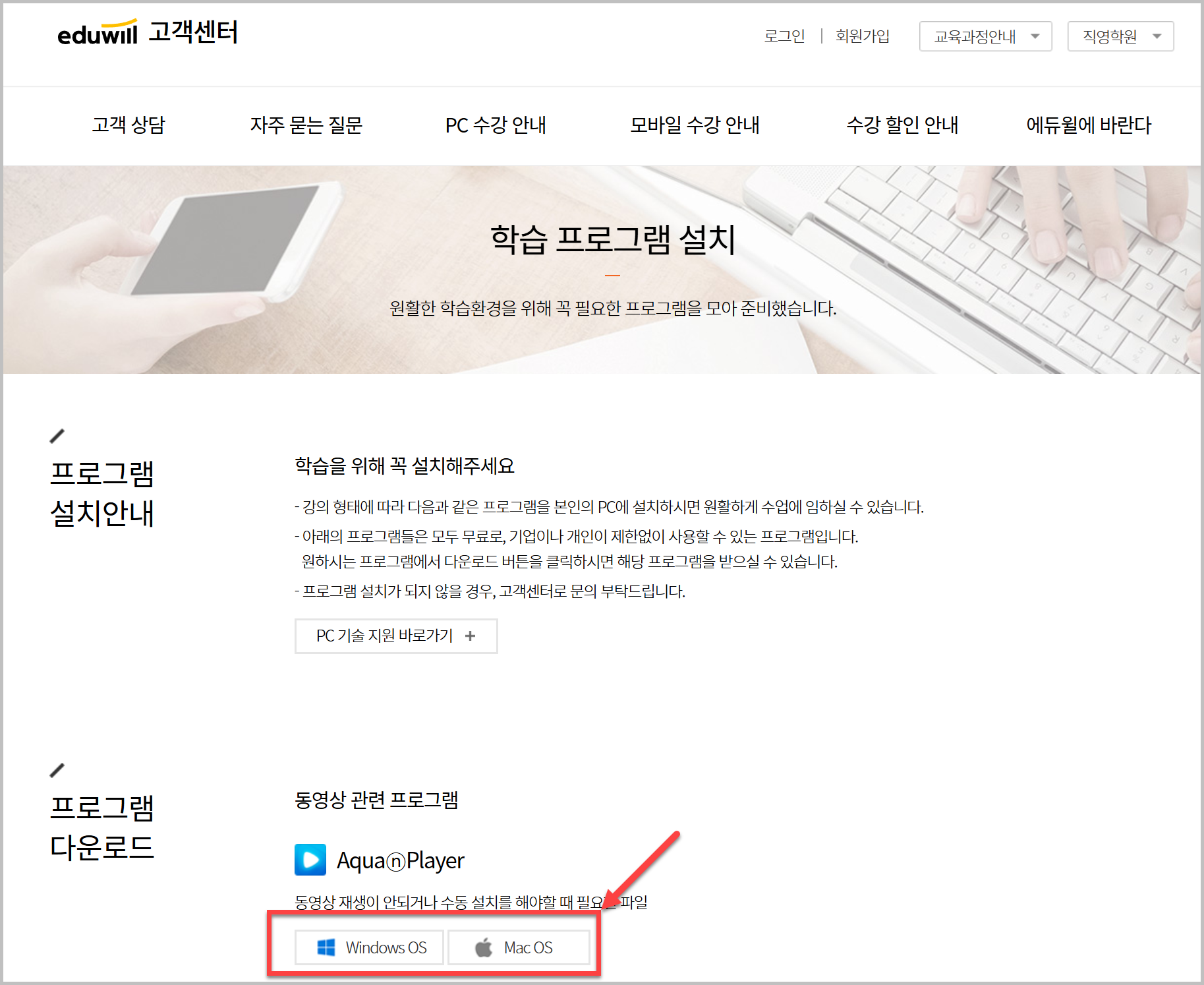 홈페이지 접속 후 ‘고객센터’ 또는 ‘FAQ’ 메뉴를 선택.‘동영상 학습’ 항목에서 AquaNPlayer 다운로드 링크를 클릭.