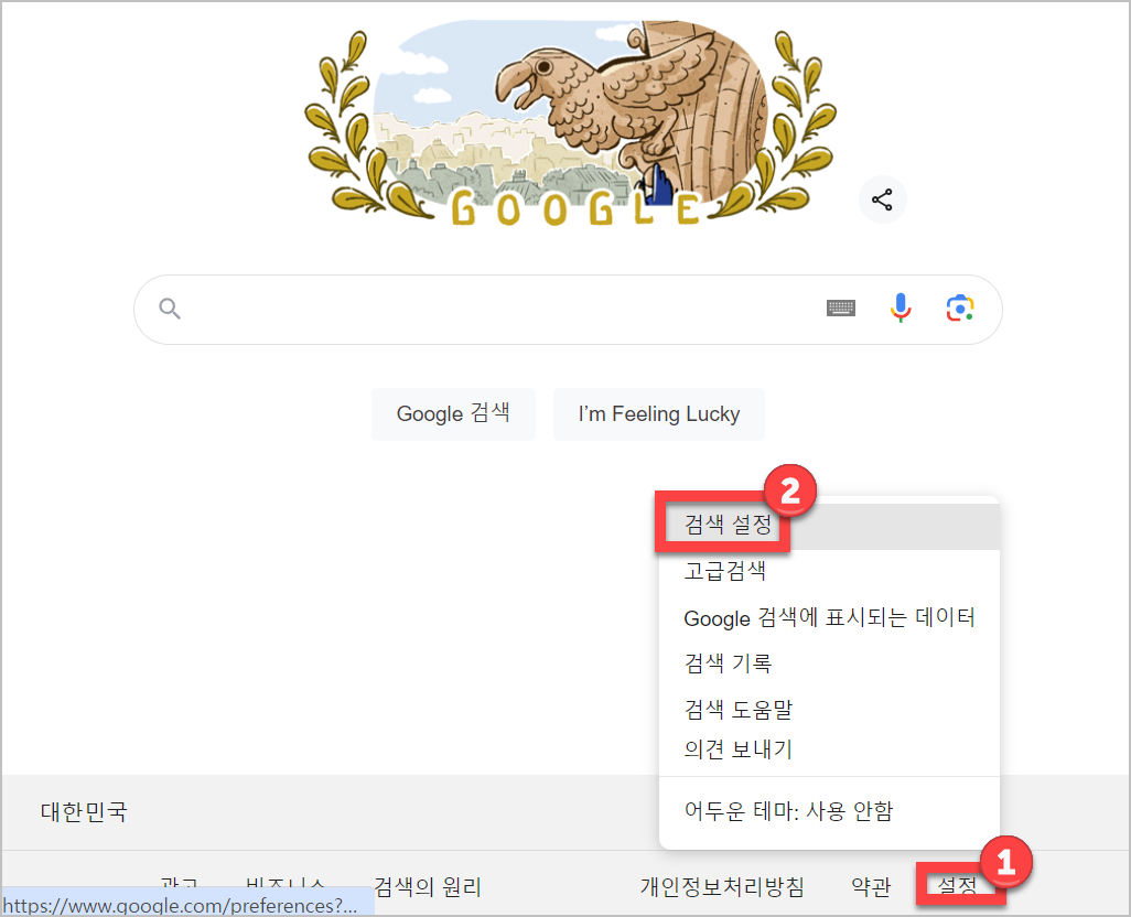 1_ 인터넷 주소창에 www.google.com 을 입력하고 방문합니다. 이후 설정 → 검색 설정으로 이동합니다.