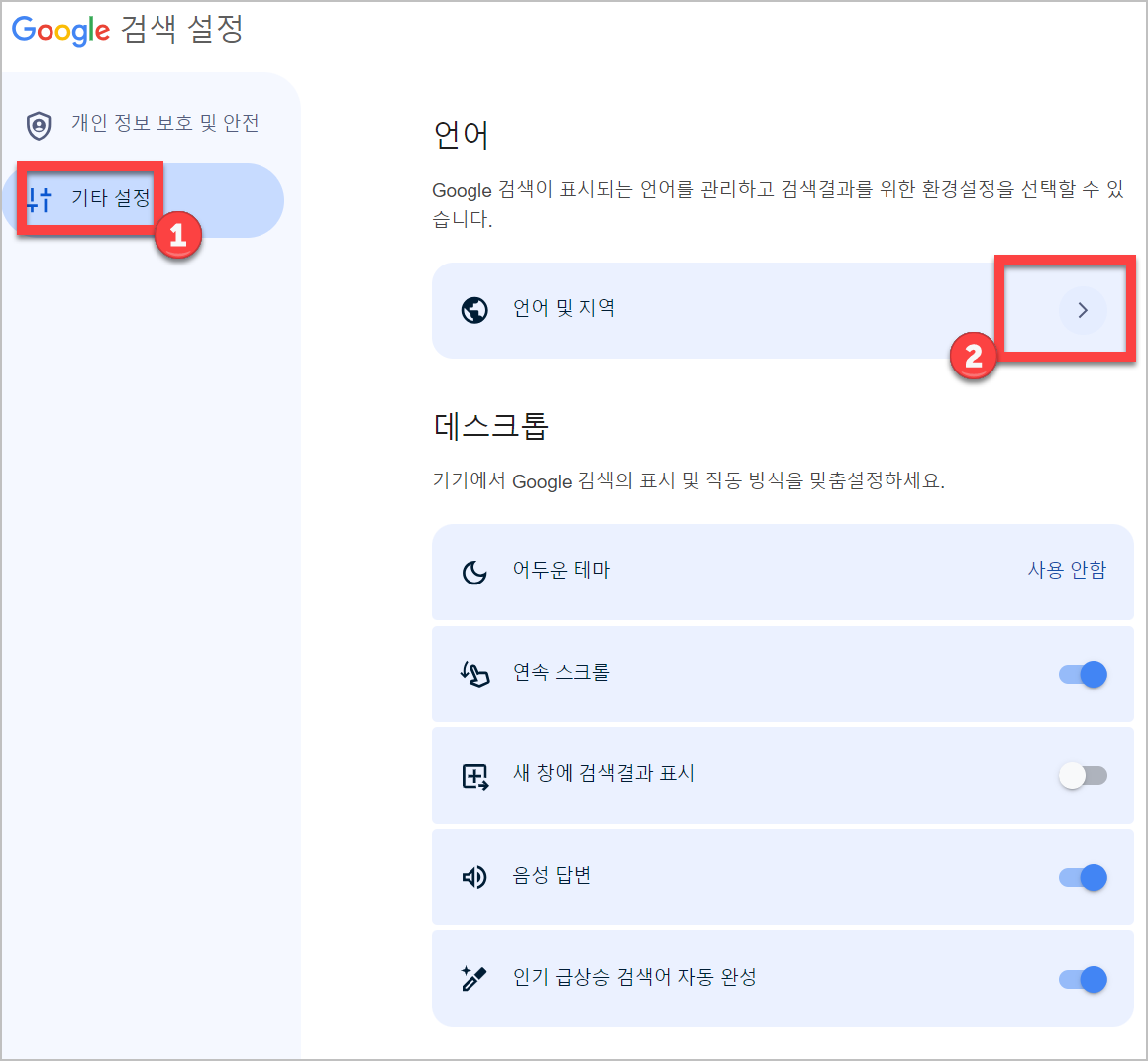 2_ 기타설정 -> 언어 및 지역 설정에서 미국을 선택하고 저장합니다.