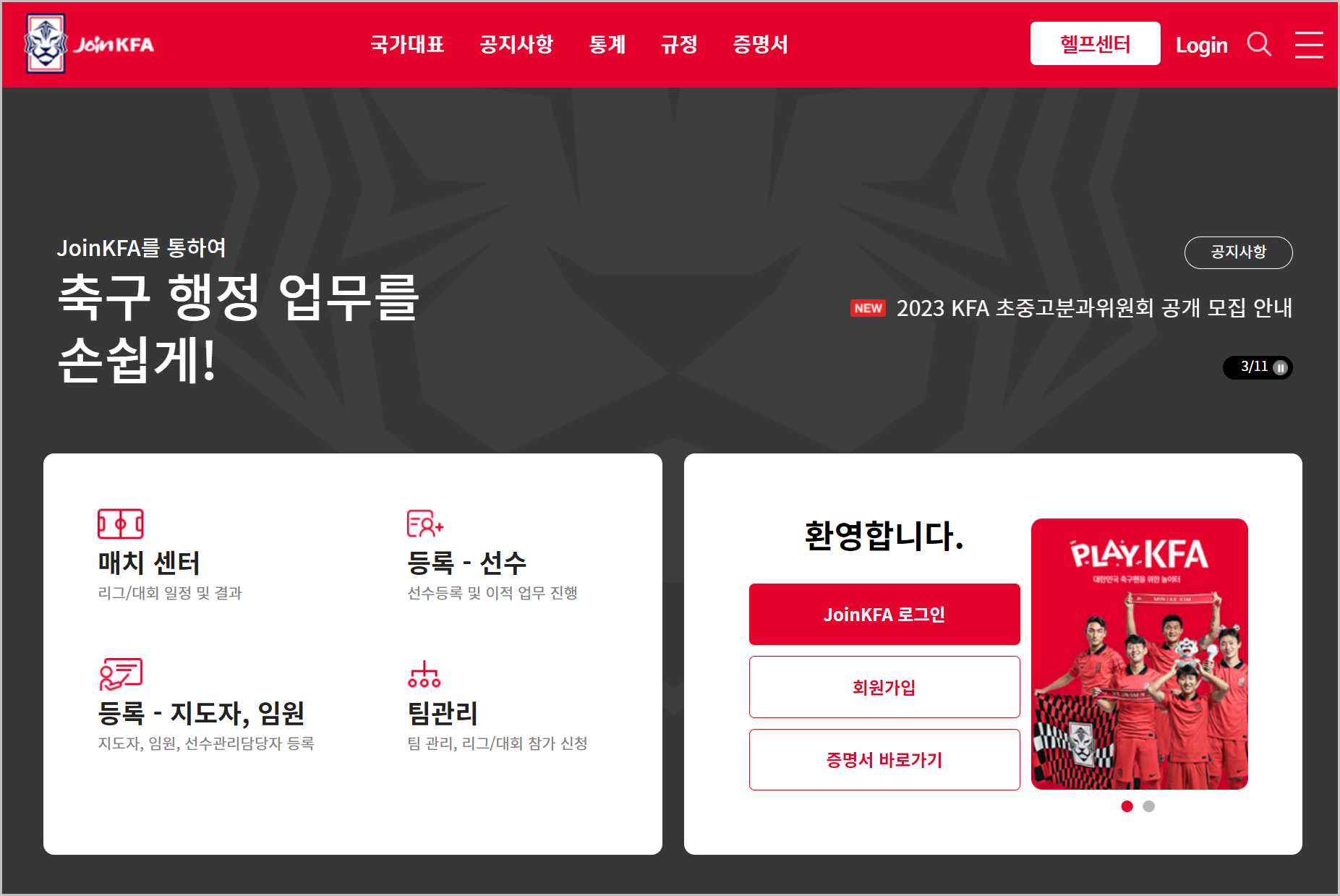 이러한 시스템을 기반으로 하여서 팀과 선수등록 그리고 이적 등 여러가지 종류의 행정처리를 전산화하여 축구인들에게 제공을 하고 있씁니다.