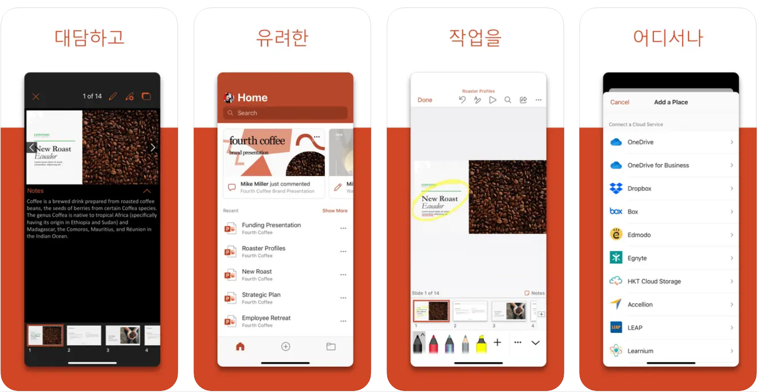 2) 스마트폰이나 태블릿에서 제공되는 PowerPoint 앱을 이용하시면 됩니다. 이 앱은 무료로 제공이 되기 때문에 이 방법도 경제적 부담이 되지 않습니다.